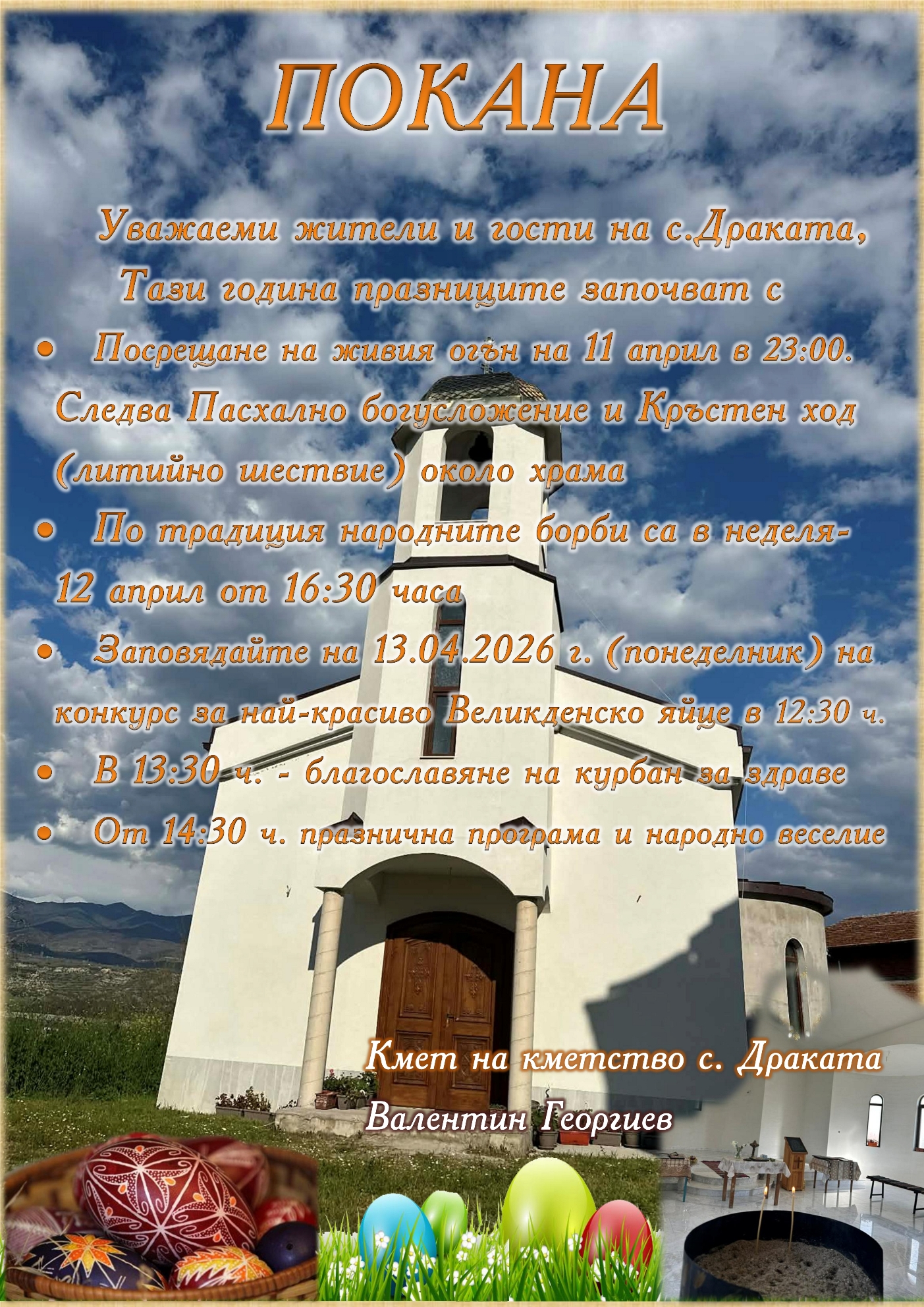 С. Драката има празник на Великден. Вижте празничната програма за 12 и 13 април. Разгледайте кадри от полагане на основния камък за изграждането на храм “Свето Възкресение Христово“ от 16.02.2023 г.