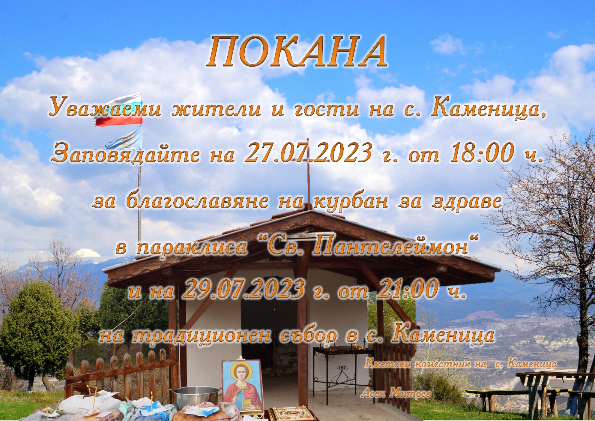 Заповядайте на 27.07.2023 г. от 18:00 ч. за благославяне на курбан за здраве в параклиса “Св. Пантелеймон“ и на 29.07.2023 г. от 21:00 ч. на традиционен събор в с. Каменица