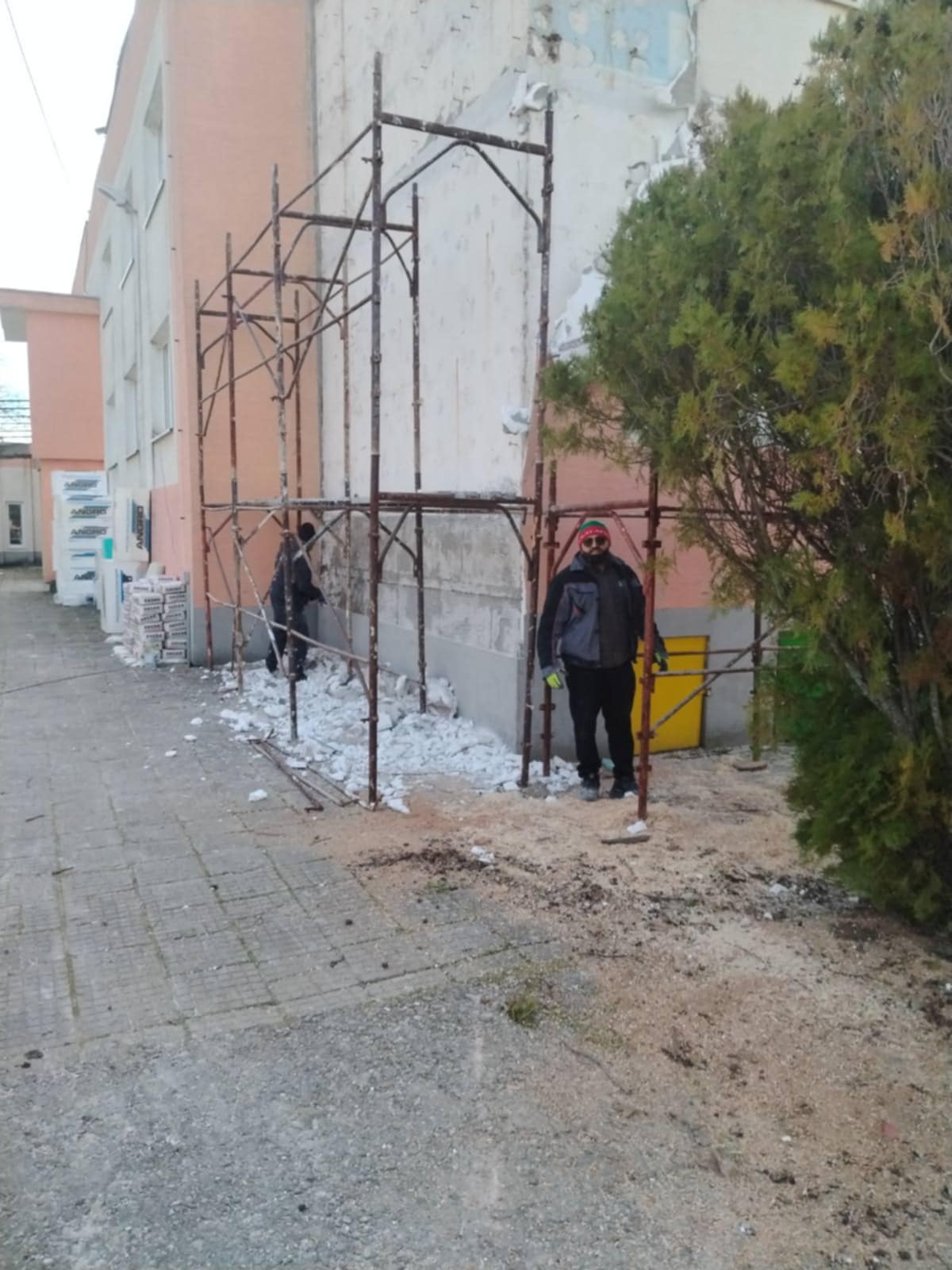 Компрометираната външна изолационна фасада е отстранена и поетапно чрез спешни ремонтно - възстановителни дейности, започва процеса по нейното възстановяване.