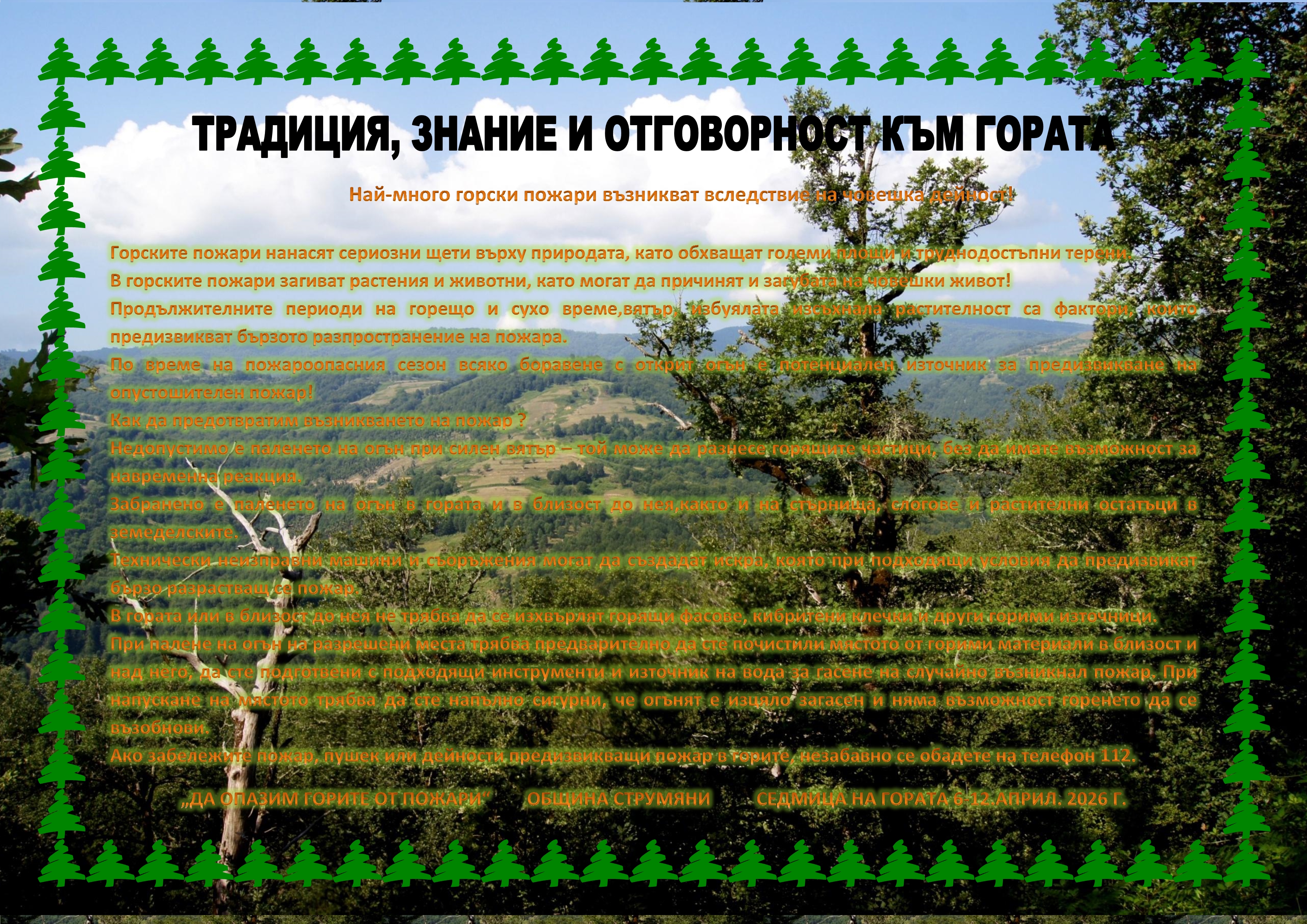 Най-много горски пожари възникват вследствие на човешка дейност! Горските пожари нанасят сериозни щети върху природата, като обхващат големи площи и труднодостъпни терени. В горските пожари загиват растения и животни, като могат да причинят и загубата на човешки живот! Продължителните периоди на горещо и сухо време,вятър, избуялата изсъхнала растителност са фактори, които предизвикват бързото разпространение на пожара. По време на пожароопасния сезон всяко боравене с открит огън е потенциален източник за предизвикване на опустошителен пожар! Как да предотвратим възникването на пожар ? Недопустимо е паленето на огън при силен вятър – той може да разнесе горящите частици, без да имате възможност за навременна реакция. Забранено е паленето на огън в гората и в близост до нея,както и на стърнища, слогове и растителни остатъци в земеделските. Технически неизправни машини и съоръжения могат да създадат искра, която при подходящи условия да предизвикат бързо разрастващ се пожар. В гората или в близост до нея не трябва да се изхвърлят горящи фасове, кибритени клечки и други горими източници. При палене на огън на разрешени места трябва предварително да сте почистили мястото от горими материали в близост и над него, да сте подготвени с подходящи инструменти и източник на вода за гасене на случайно възникнал пожар. При напускане на мястото трябва да сте напълно сигурни, че огънят е изцяло загасен и няма възможност горенето да се възобнови. Ако забележите пожар, пушек или дейности предизвикващи пожар в горите, незабавно се обадете на телефон 112. „ДА ОПАЗИМ ГОРИТЕ ОТ ПОЖАРИ“ ОБЩИНА СТРУМЯНИ СЕДМИЦА НА ГОРАТА 6-12.АПРИЛ. 2026 Г.