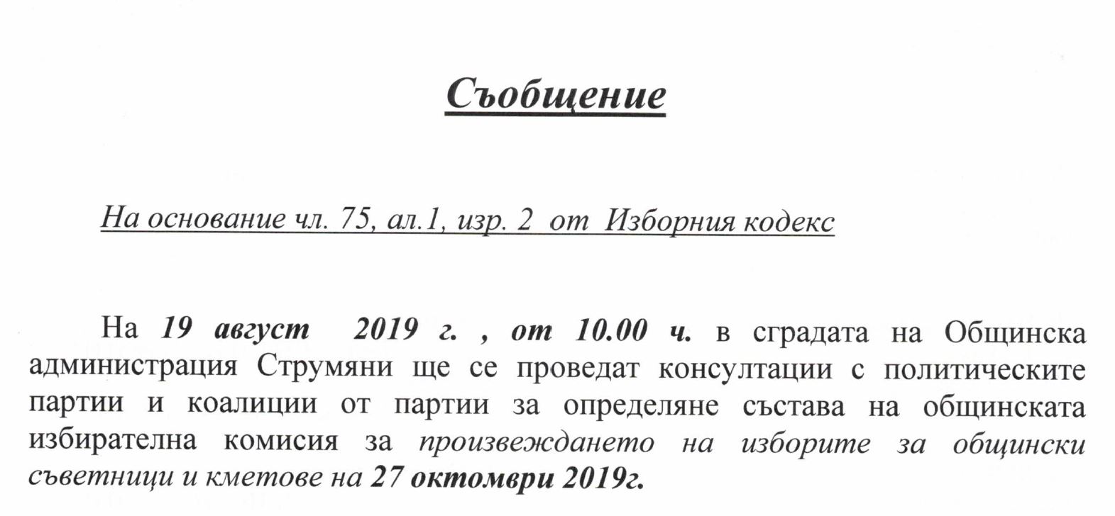 Провеждане на консултации във връзка определяне състава на Общинската избирателна комисия