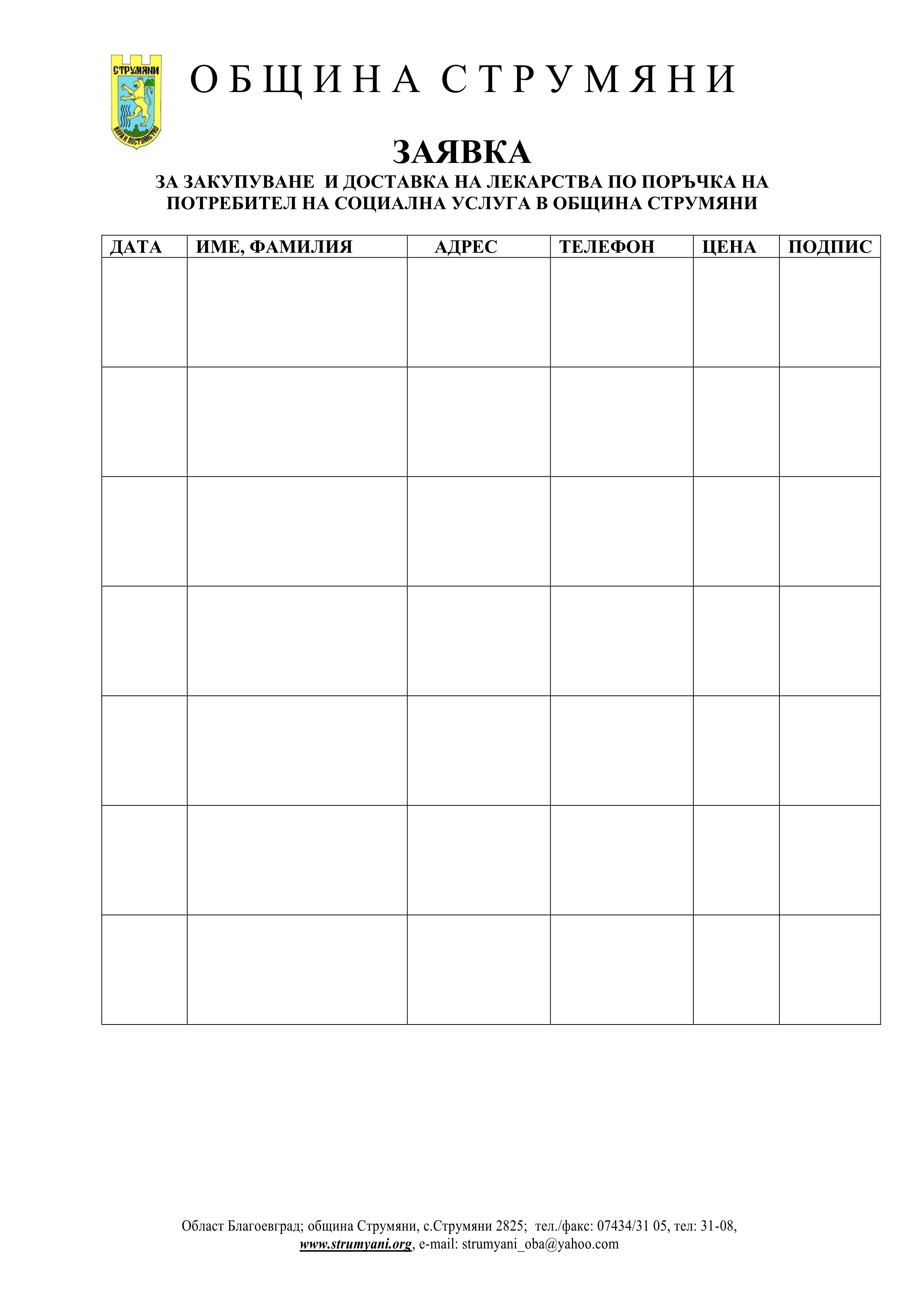 Заявките ще бъдат изпълнявани в срок от 3 /три/ дни и ще бъдат приемани на телефон: 0878450069 от г-жа Василка Драчева или можете да направите заявка и на e-mail: csri_strumyani@abv.bg.