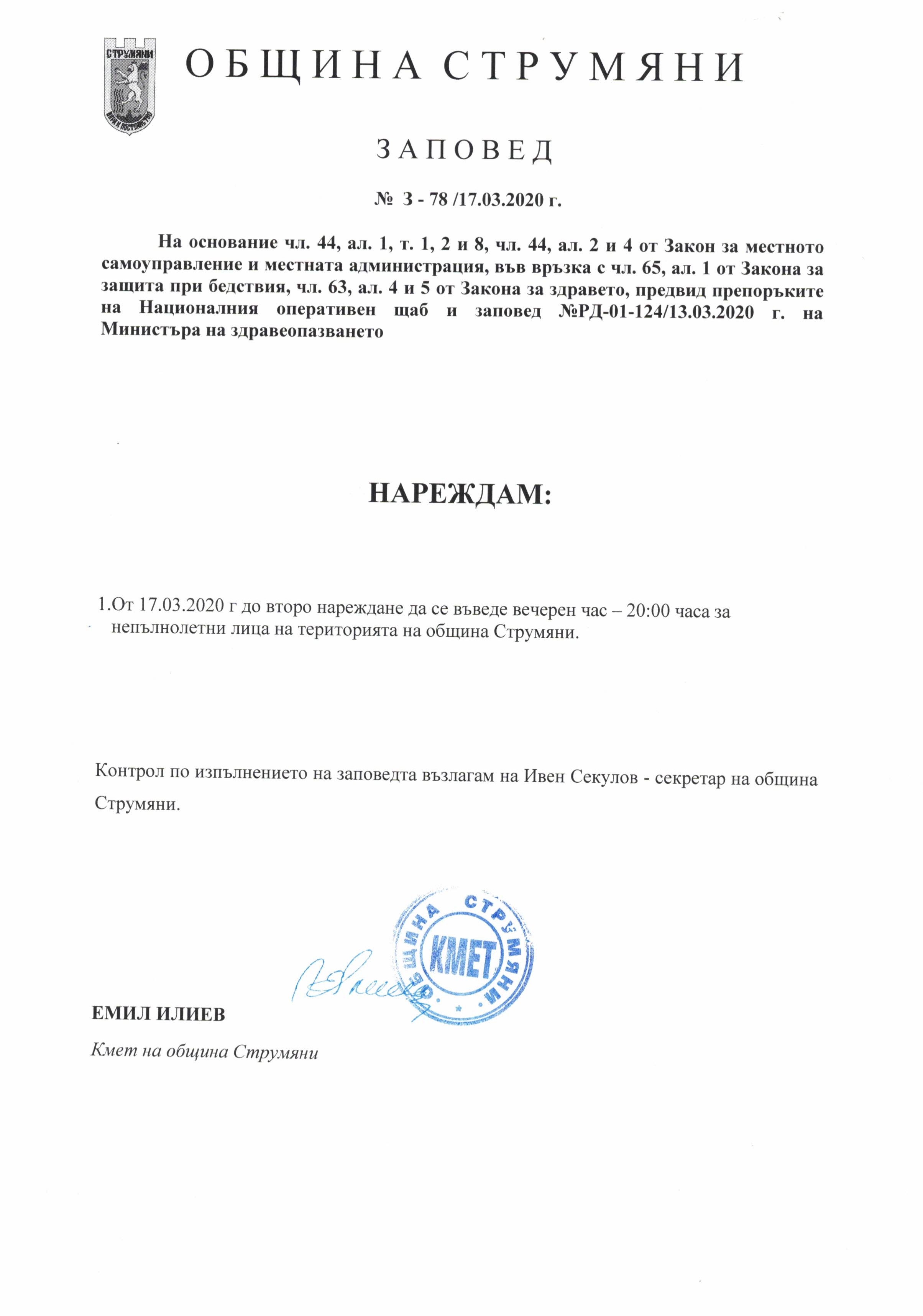 С цел превенция срещу разпространението на заразата COVID -19, въвеждаме вечерен час за непълнолетни лица на територията на община Струмяни.(З-78/17.03.2020)