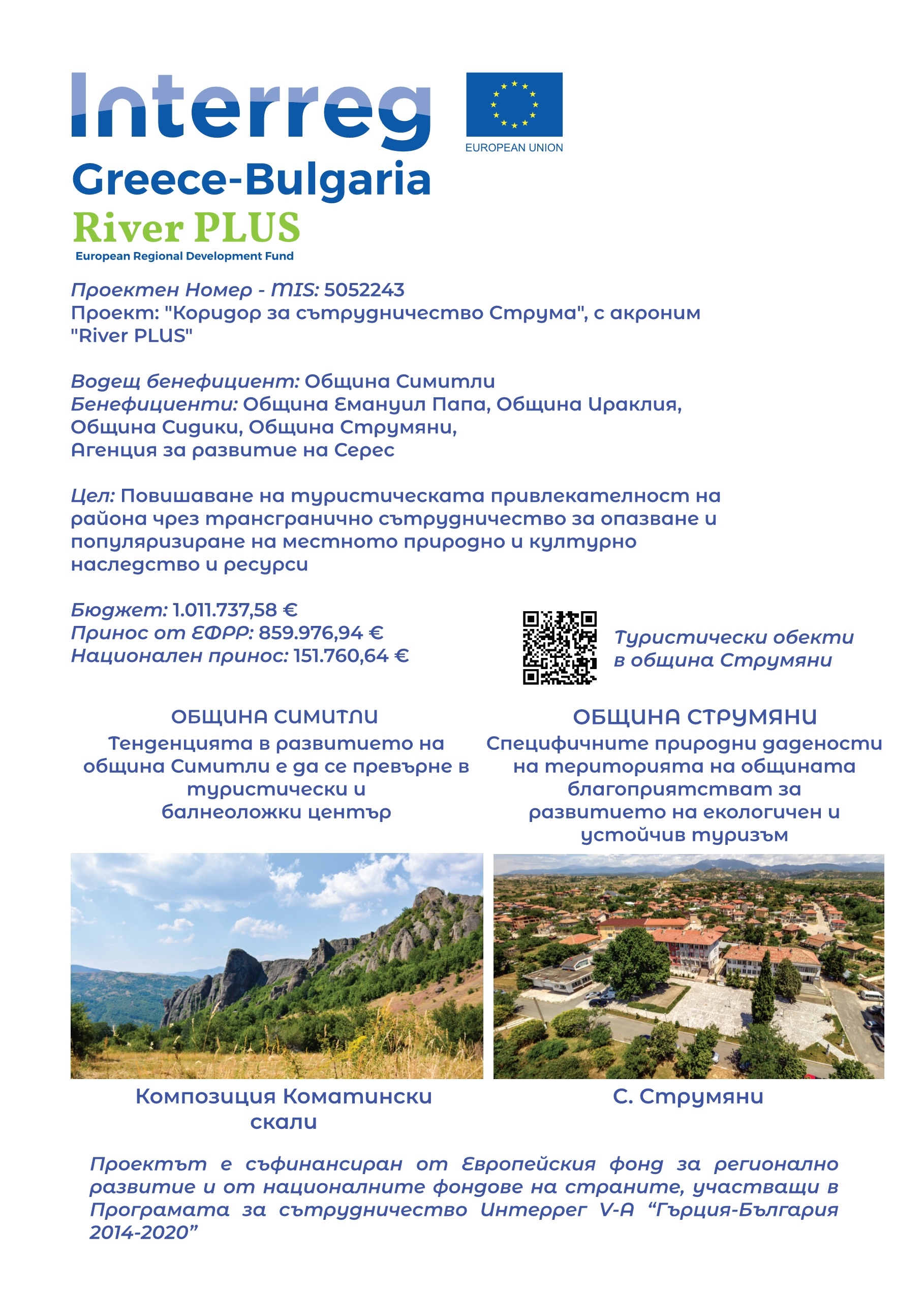 Районът на проекта се характеризира с богато културно и природно наследство. Общините Симитли и Струмяни в България и Ираклия, Синтики и Емануел Паппа в Гърция, разположени край река Струма, имат големи територии, принадлежащи към зони от Натура 2000 и други защитени територии.