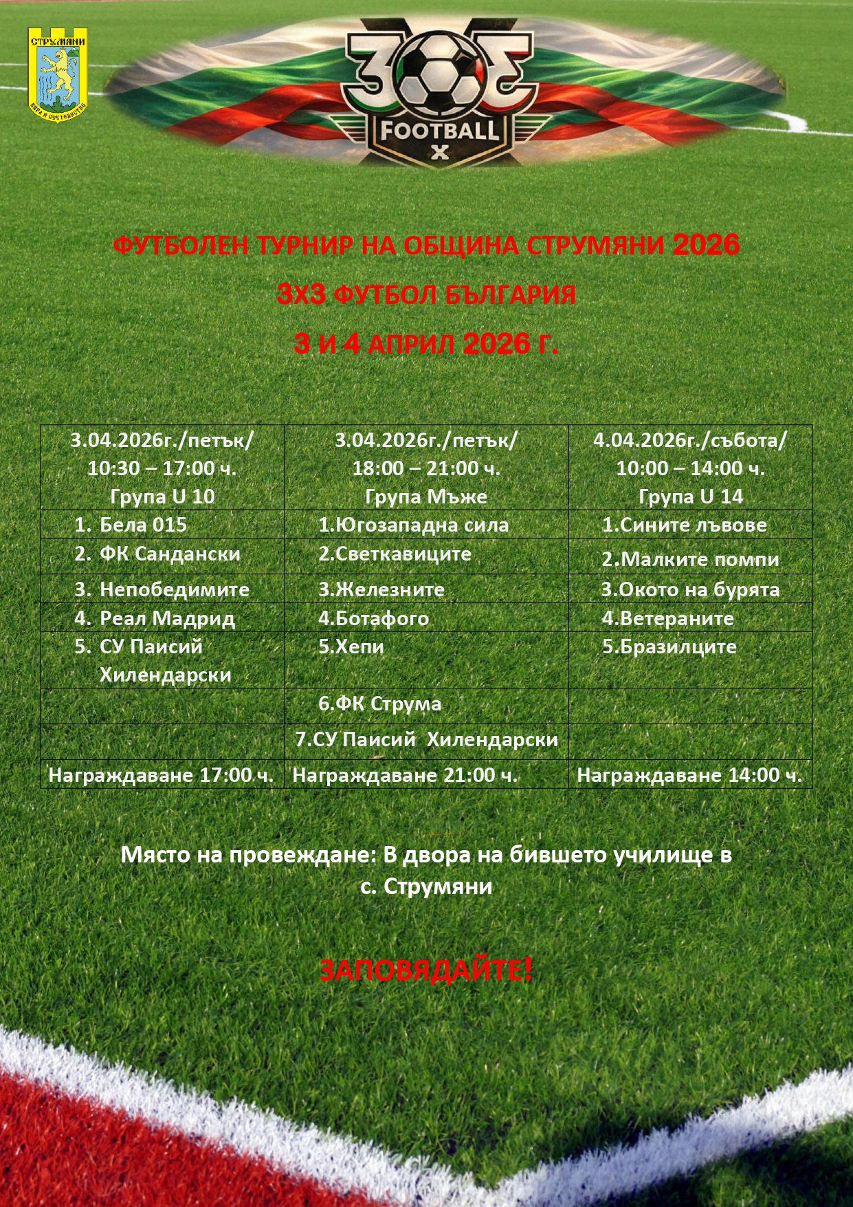 Празникът на Община Струмяни тази година ще бъде отбелязан на 4-ти април (събота) с празнична програма. Начало на събитията е в 16.00 ч. на площад "7-ми април" с. Струмяни