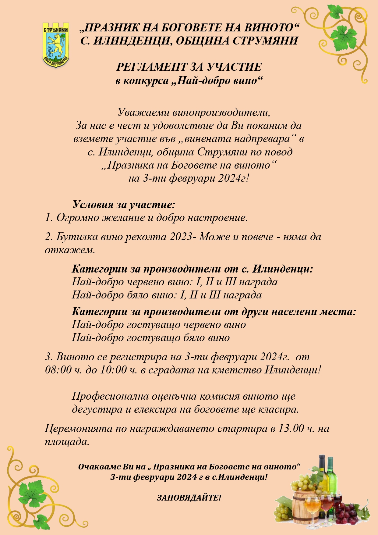 по повод „ПРАЗНИК НА БОГОВЕТЕ НА ВИНОТО“ на 3-ТИ ФЕВРУАРИ 2024 г. в с. ИЛИНДЕНЦИ, община Струмяни ви каним да вземете участие в конкурса „Най-добро вино“.
