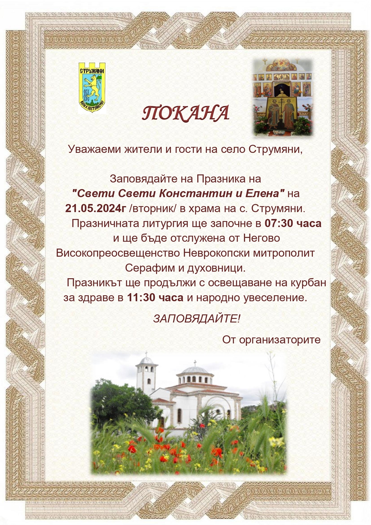 Заповядайте на Празника на "Свети Свети Константин и Елена" на 21.05.2024г /вторник/ в храма на с. Струмяни.Празничната литургия ще започне в 07:30 часа и ще бъде отслужена от Негово Високопреосвещенство Неврокопски митрополит Серафим и духовници.Празникът ще продължи с освещаване на курбан за здраве в 11:30 часа и народно увеселение.ЗАПОВЯДАЙТЕ!