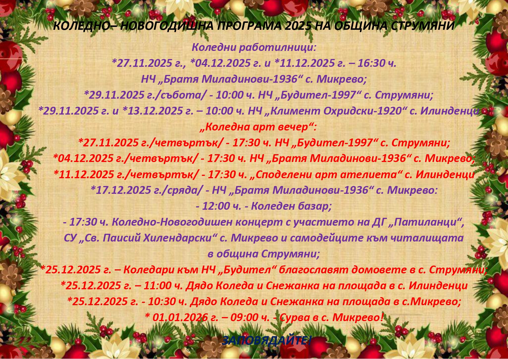 КОЛЕДНО-НОВОГОДИШНА ПРОГРАМА 2025 НА ОБЩИНА СТРУМЯНИ!